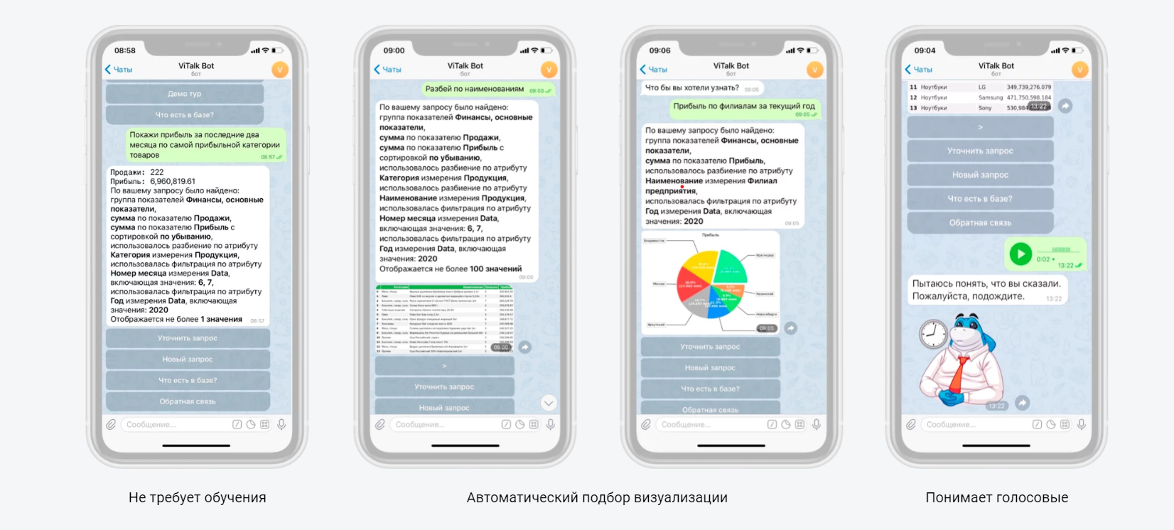 В состав платформы входит виртуальный аналитик ViTalk, который может отвечать на вопросы на естественном языке. Для его использования от пользователя не требуется навыков работы в системе или знаний об организации базы данных. В основе ViTalk лежат технологии NLP, машинного обучения и математической лингвистики. ViTalk не ищет ответы в уже созданных отчетах, а самостоятельно строит простые отчеты, соответствующие запросу.